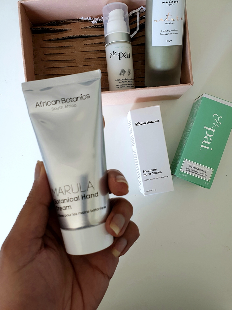 Boxwalla beauty box feautring Pai Sea Aster and Wild Oat, Nini Organics Natura Detox Foam and African Botanics Marula Botanical hand cream